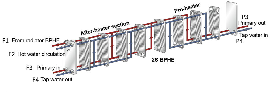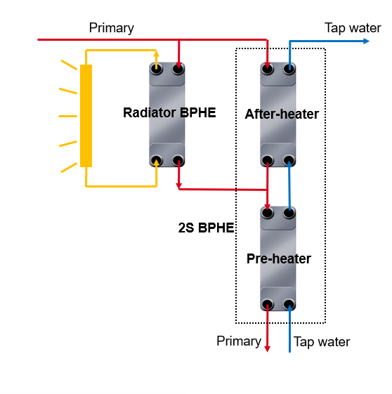 The main purpose of the pre-heater is to preheat the cold water before it enters the after-heater by utilizing the primary flow from the radiator heat exchanger which is further cooled down before returning to the heat source. The primary return temperature can be substantially lower compared to a parallel system provided recirculation of hot tap water is taken into consideration due to use of separate ports in the two stage system in contrast to a parallel system. If the primary flow from the radiator is much bigger than from the after-heater, there's a risk of an oversized heat exchanger for tap water production.