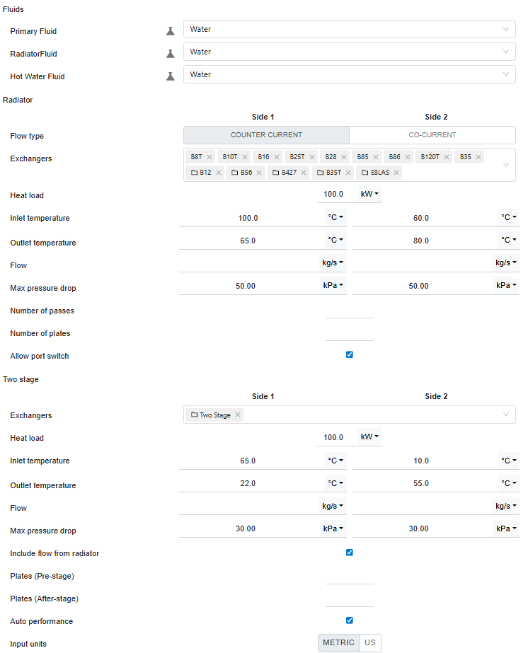 The Two Stage window offers the same calculation functionality as the regular Single Phase window, one window each for Design, Performance and Rating calculation. But in contrast to the Single Phase window it´s possible to connect the Radiator heat exchanger and the Two Stage heat exchanger like in the description above. Two stage result is not a single BPHE, but a system of collaborative heat exchangers. The calculation is made by in turn specifying the fluids, the radiator heat exchanger working conditions (winter conditions), the two stage heat exchanger working conditions (summer conditions) and possible connection between the heat exchangers (Include flow from radiator) (*). To enable flow optimization of the primary stream from the Radiator select "Auto Performance" (**). Performance mode works in a similar manner as Auto Performance for a given design.